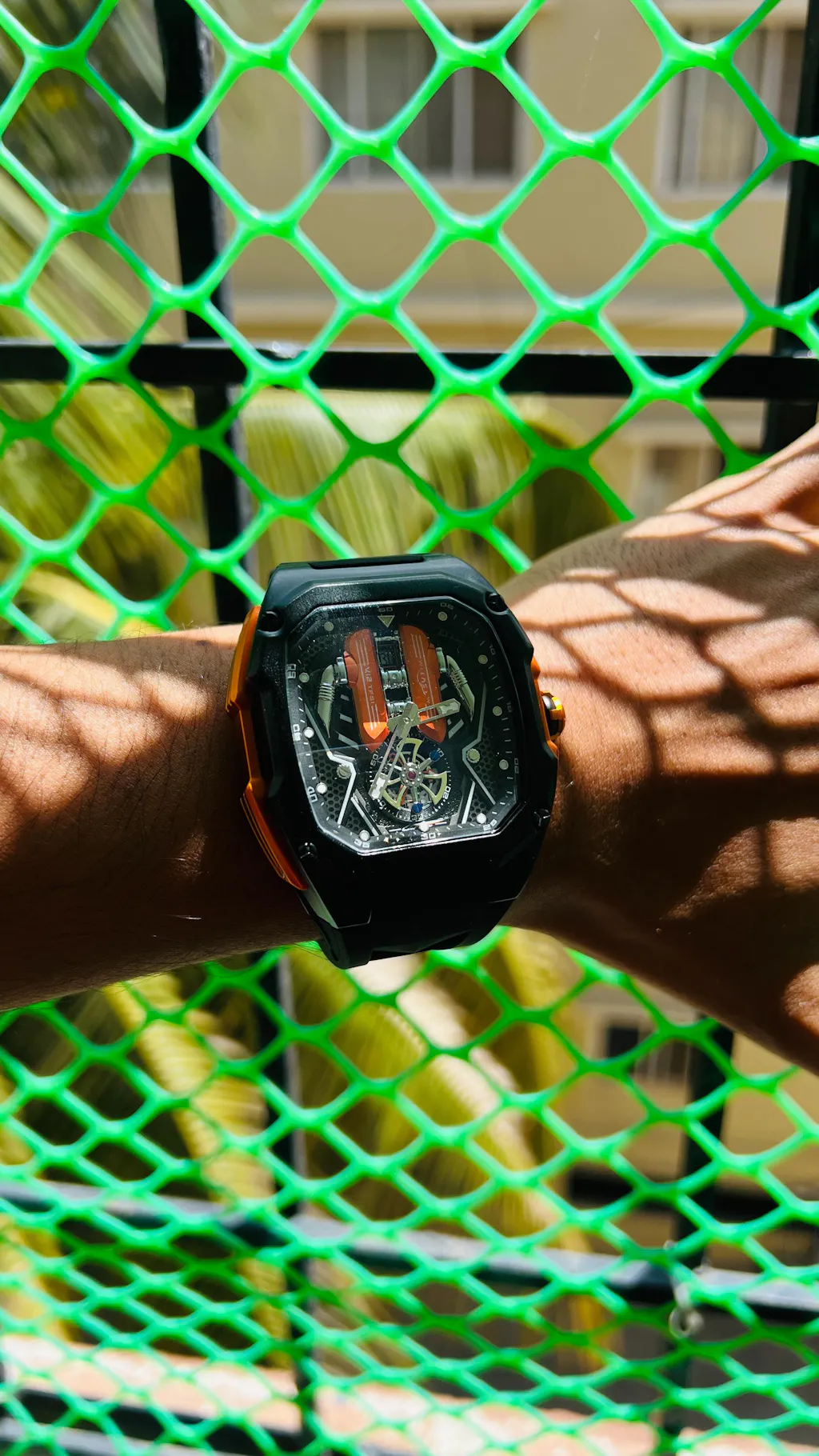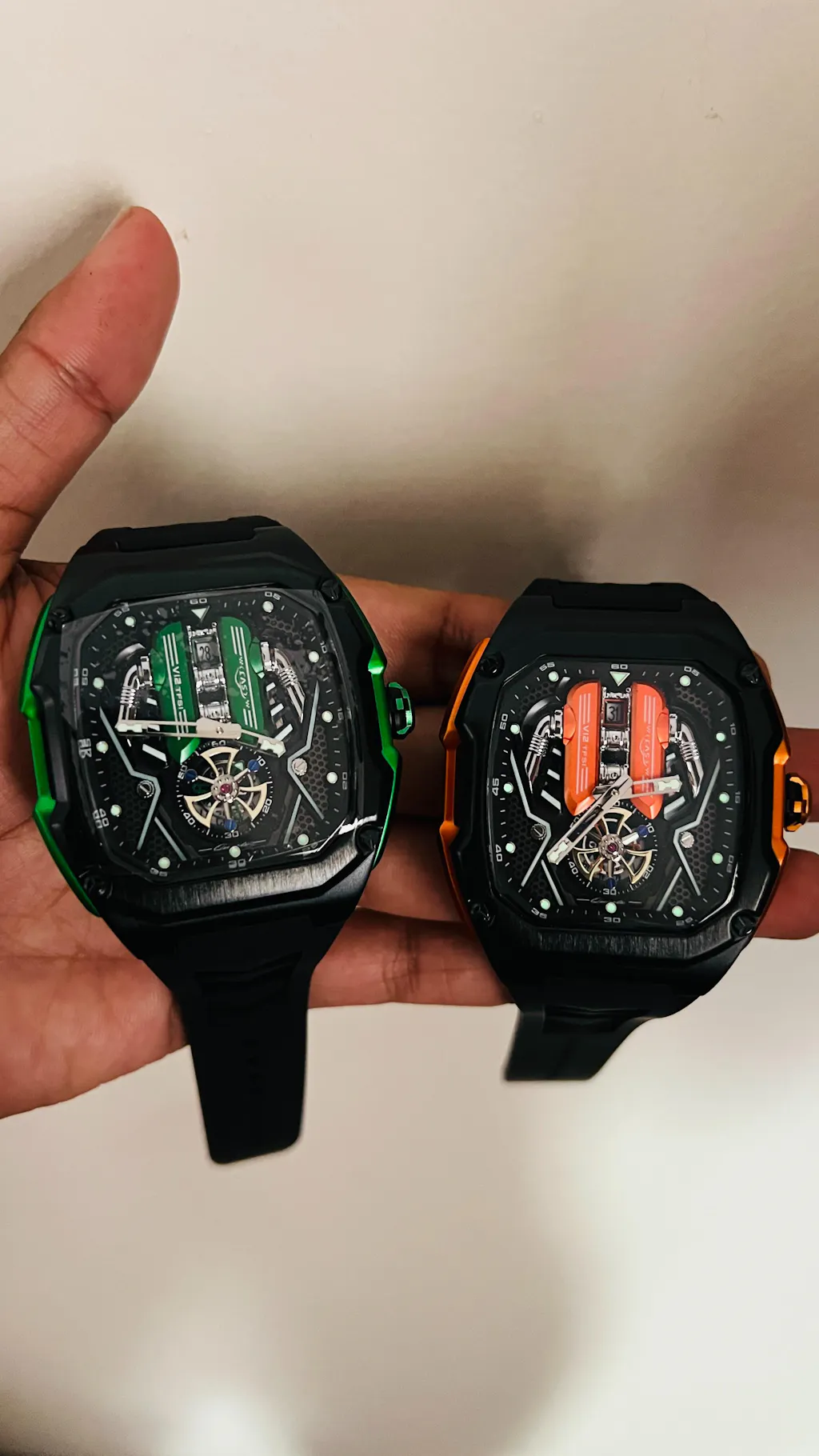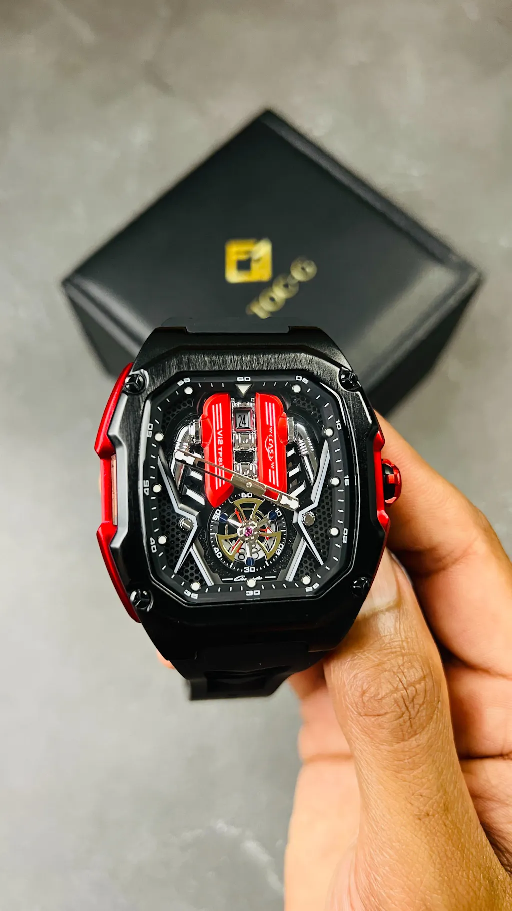The Toc-G V12 Aventador SVJ Watch is a bold, supercar-inspired timepiece that brings the drama of a Lamborghini V12 engine straight to your wrist. With its engine-block dial, tubular “ENGINE” pillars, 3D mechanical layers, and striking green accents, it looks like a miniature power unit in motion. The octagonal case, exposed screws, and sporty rubber strap add to its aggressive, high-performance vibe.